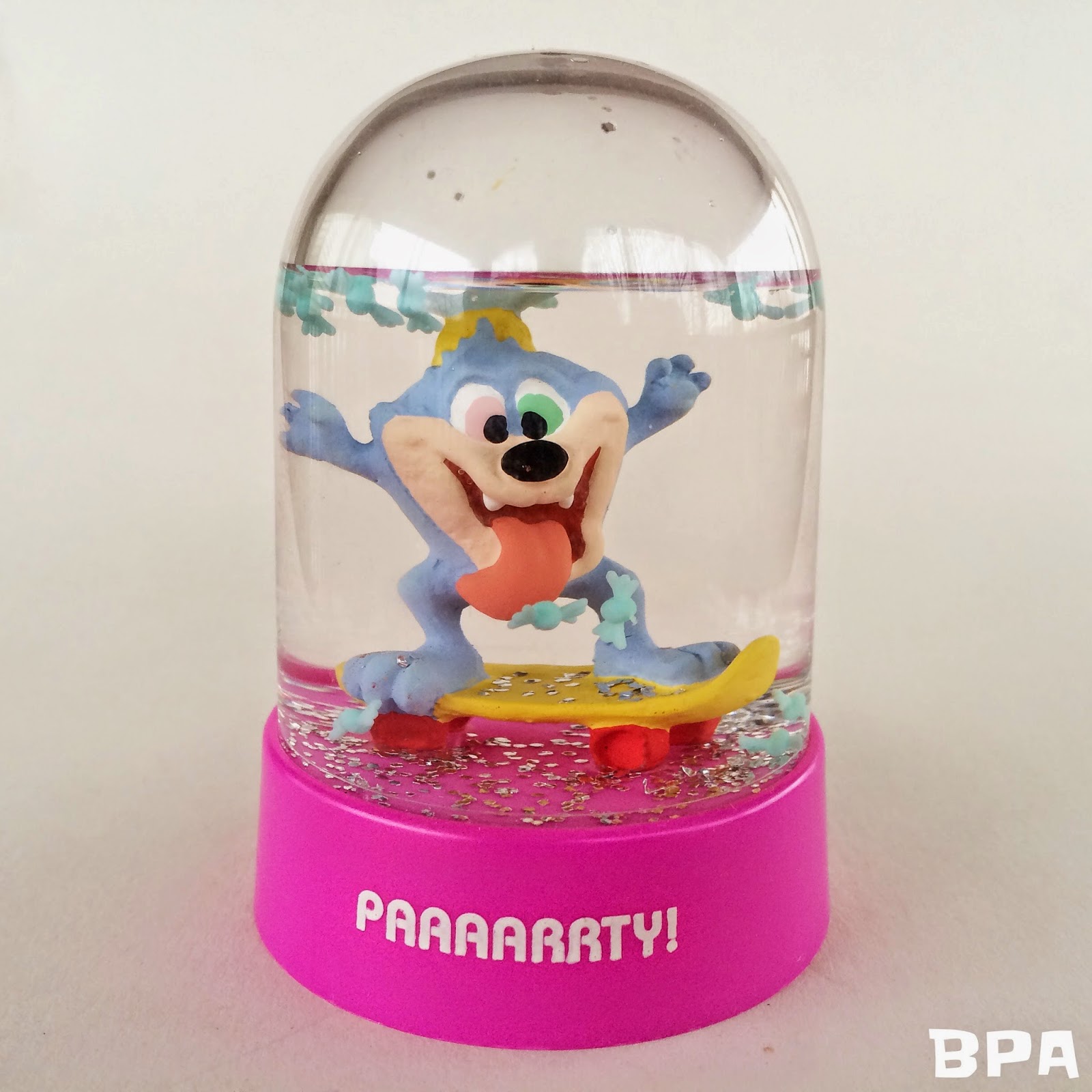 Dizzy Devil is definitely feeling the BPA in this snow globe. In addition to glitter there are also pieces of candy floating around inside and the "PAAAARRTY!" exclamation on the base. I thought about trying to crack this thing open to get the figure out but decided to leave as-is for now. There is no date on this but it is safe to assume that it was made in the early '90s during Tiny Toon Adventures original run ('90-'95). Dizzy is not the first Tiny Toon to appear on BPA - that honor belongs to Plucky Duck. He is the first Tasmanian devil to appear here though.
